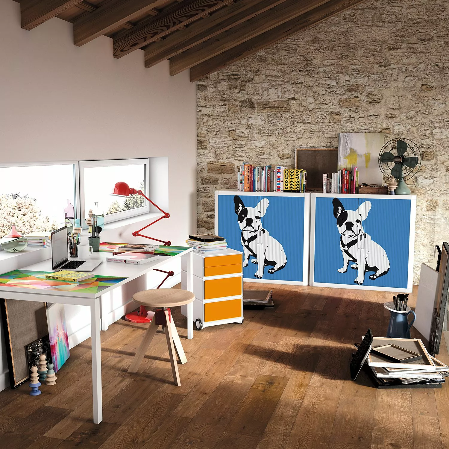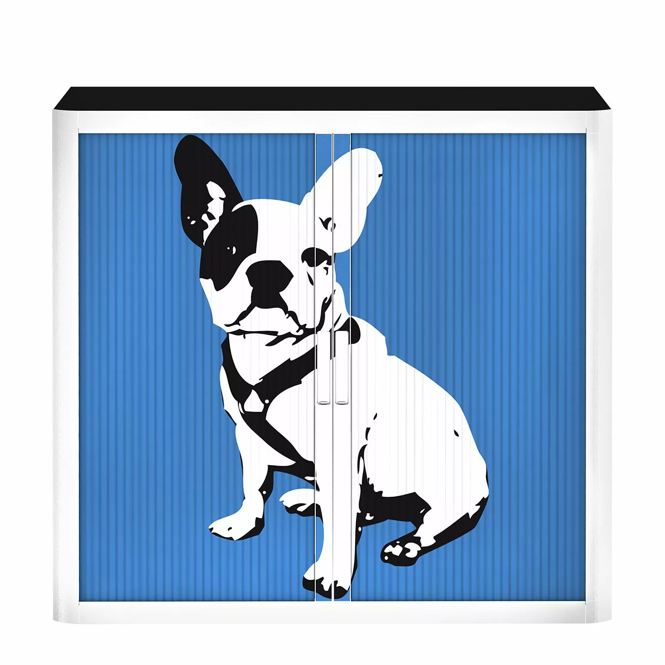 - Klare, geradlinige Form mit französischer Bulldogge auf farbigem Grund