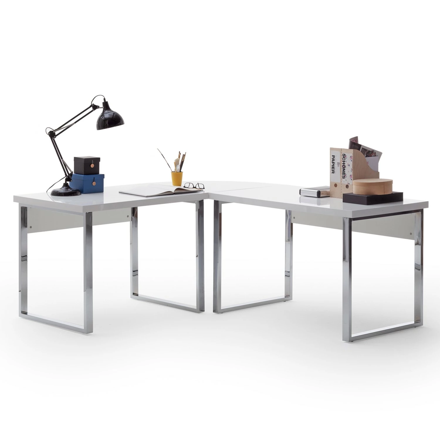 - Tischplatte & Blende: Hochglanz Weiß