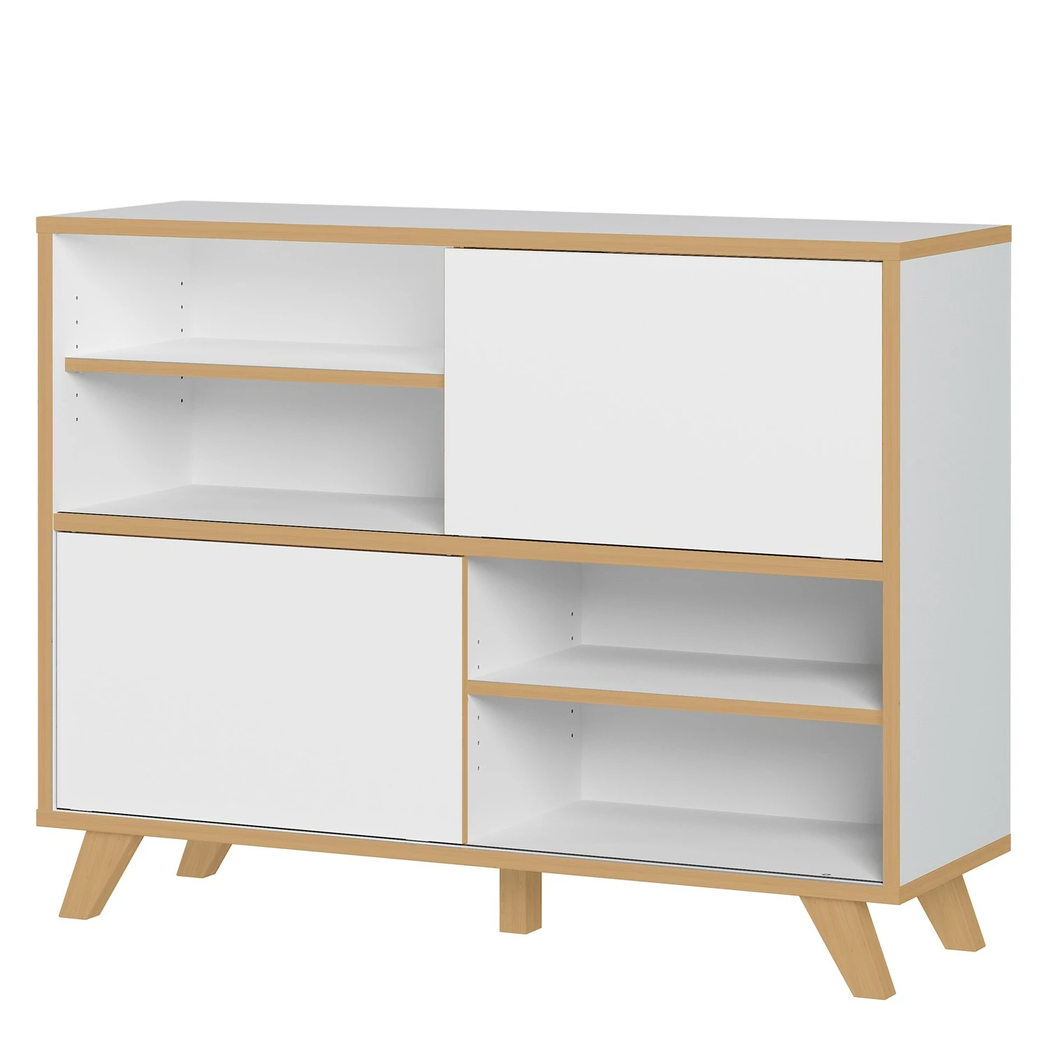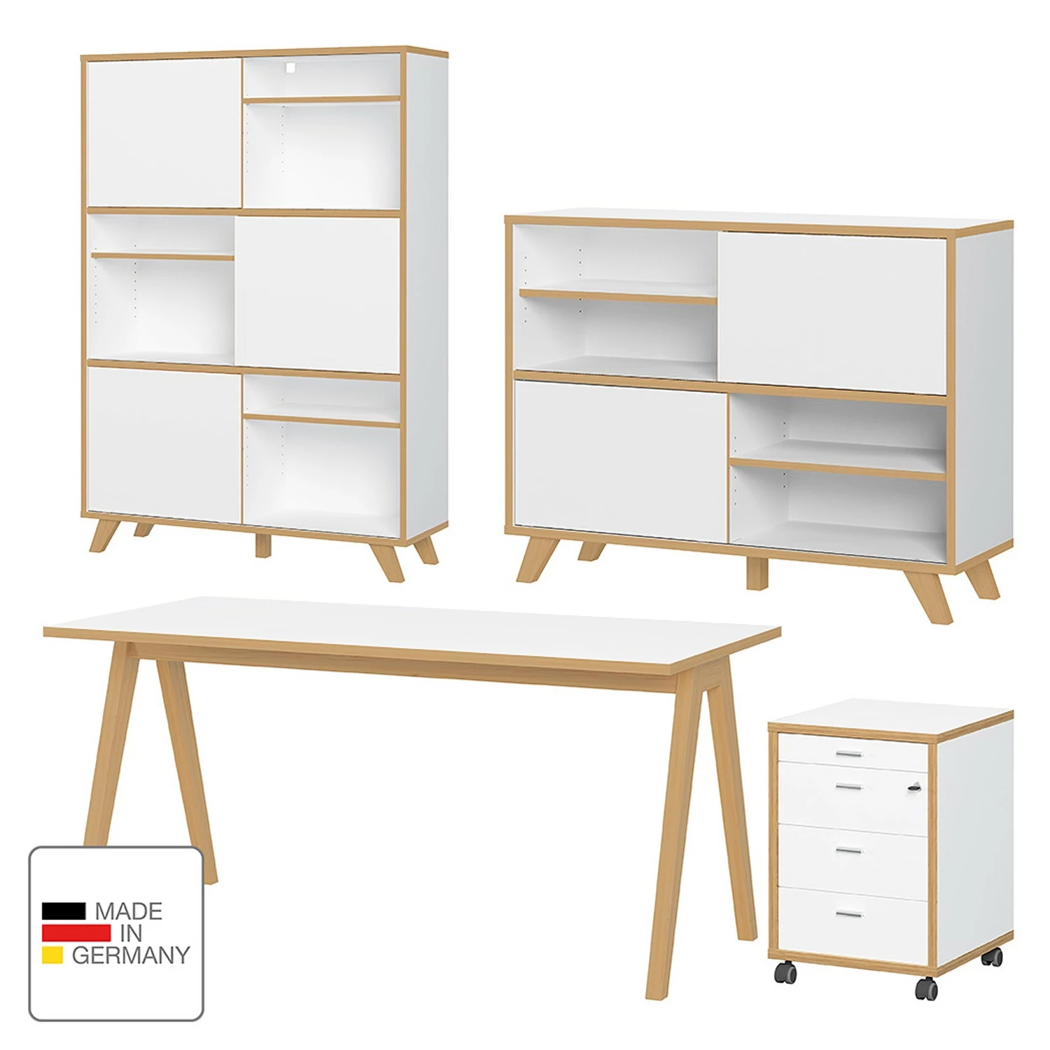 - Lieferumfang: 1 Schreibtisch, 1 Rollcontainer & 2 Schiebetürregale ohne Dekoration