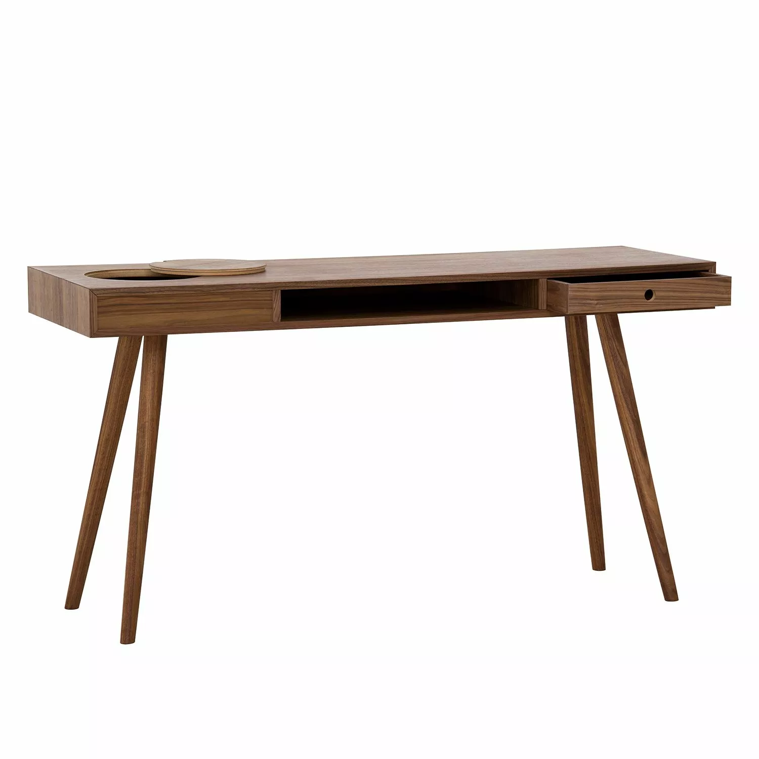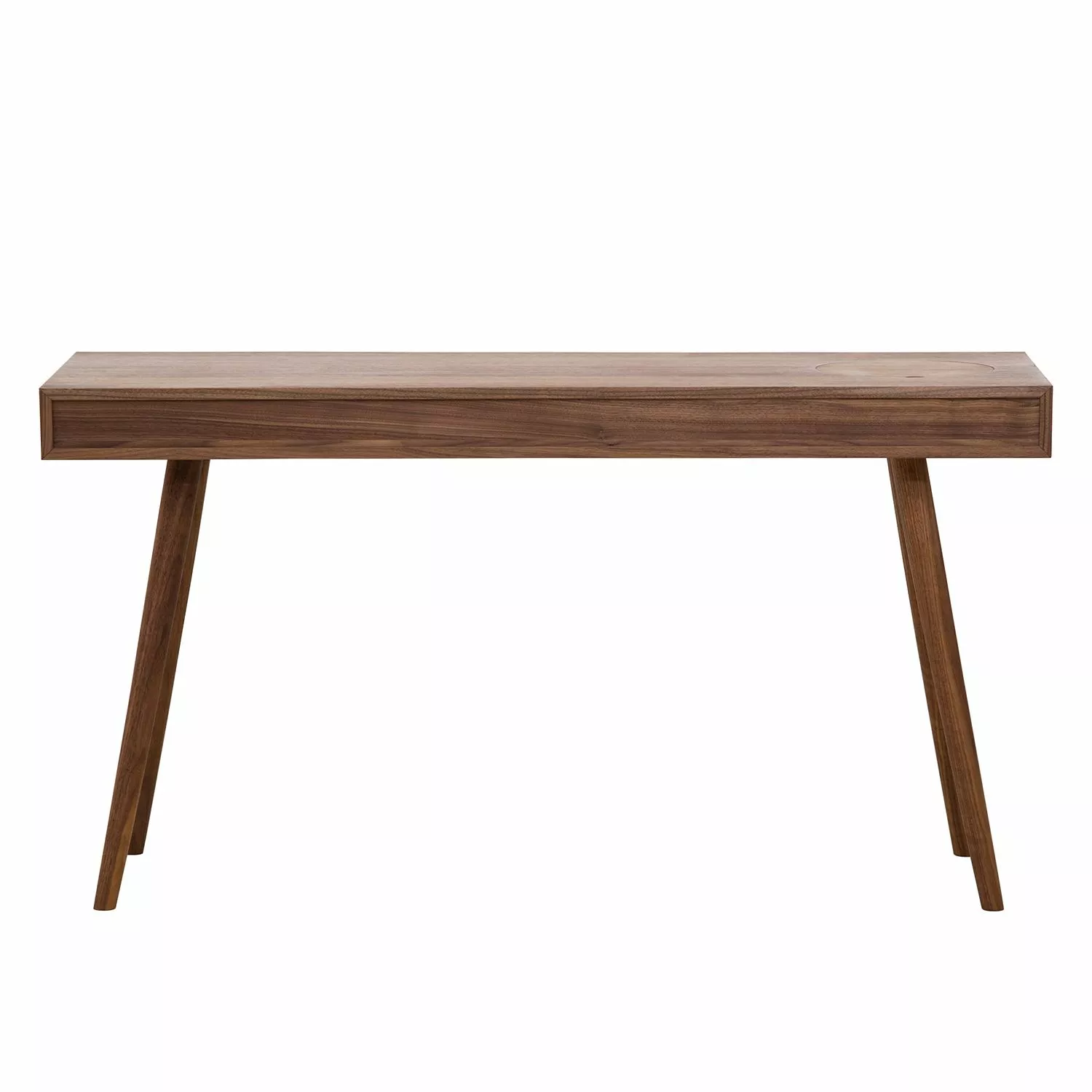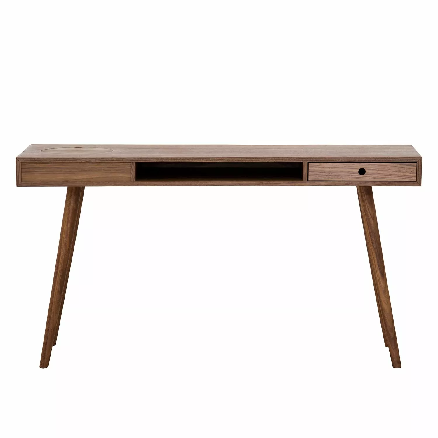 Der Schreibtisch Kierkegaard präsentiert sich in geradliniger puristischer Form mit schlanken Proportionen und passt sowohl zu einer modernen skandinavischen Einrichtung als auch zu Möbeln im Retro-Design. Dezentes Design kombiniert mit hoher Funktionalität, machen das elegante Möbelstück zu etwas ganz Besonderem. Front und Korpus des Schreibtisches Kierkegaard sind aus hochwertigen MDF-Platten gefertigt. Einen extravaganten Blickfang bilden die aus massivem geölten Walnussholz gefertigten schlanken schräg gestellten Beine des Tisches. Eine Schublade, ein offenes Fach sowie ein Stauraum mit Kabeldurchlass bieten Ablagefläche für Papiere und kleinere Gegenstände.
