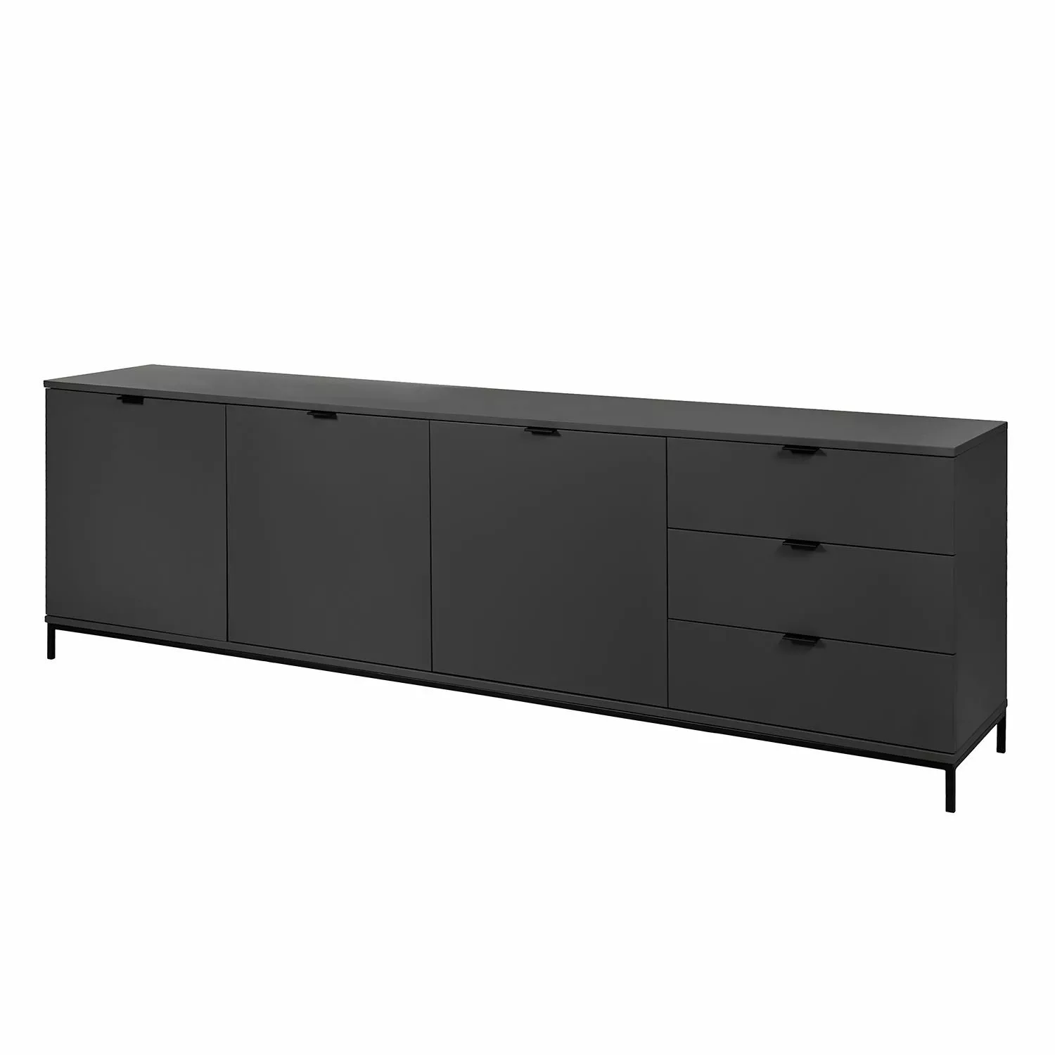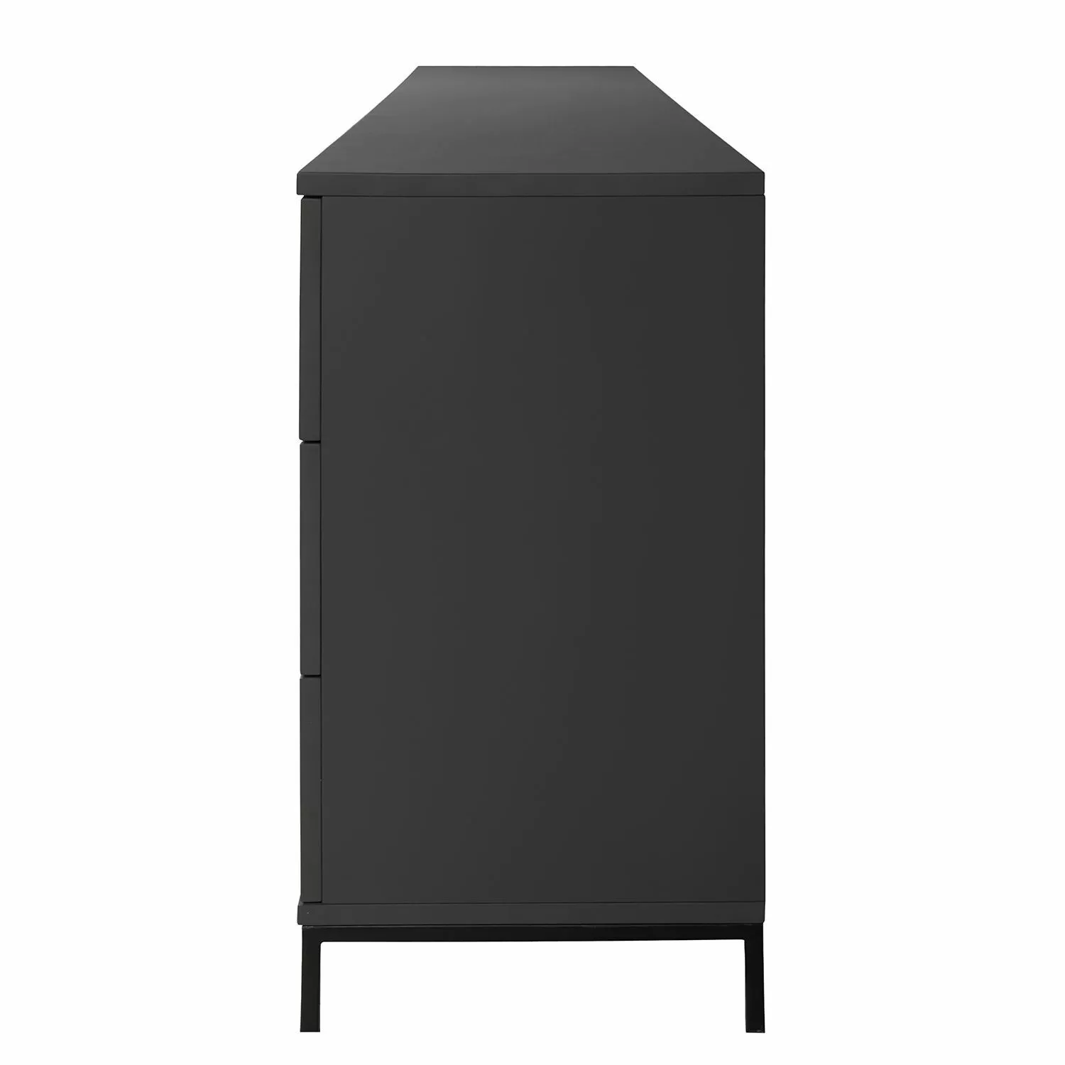 Im Schlafzimmer, im Wohnzimmer oder im Eingangsbereich leistet das minimalistische Sideboard Harma I hervorragende Dienste. Genügend Platz für das Hab und Gut ist hinter den drei Holztüren und in den drei Schubladen vorhanden. Die drei Einlegeböden bieten mehr Übersicht im Inneren. Auf den stabilen lackierten Metallfüßen steht der Korpus aus beschichteten MDF-Platten der Güteklasse E1. Praktischerweise verfügt das geräumige Sideboard Harma I über eine Soft-Close-Funktion. Geräuscharm gleiten die Schubladen zurück in den Schrank. Auch die Türen lassen sich leise schließen. Das schont nicht nur das Material, sondern weckt auch keine schlafenden Mitbewohner auf.